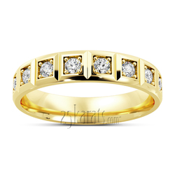 This 4mm wide Diamond wedding band set has a square design with beveled edges. The ladies' band is finished with 8 round diamonds, totaling 0.24ct.
