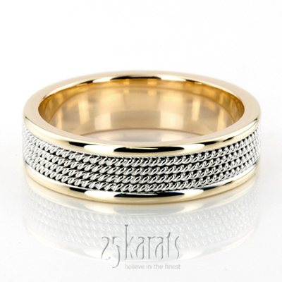A gorgeous contemporary style, this 6mm wide Hand crafted wedding ring has four shiny rows of White Gold braids, and Yellow gold edges. Small braids in the center of the band are White Gold high polished. Each side are Yellow gold high polished.