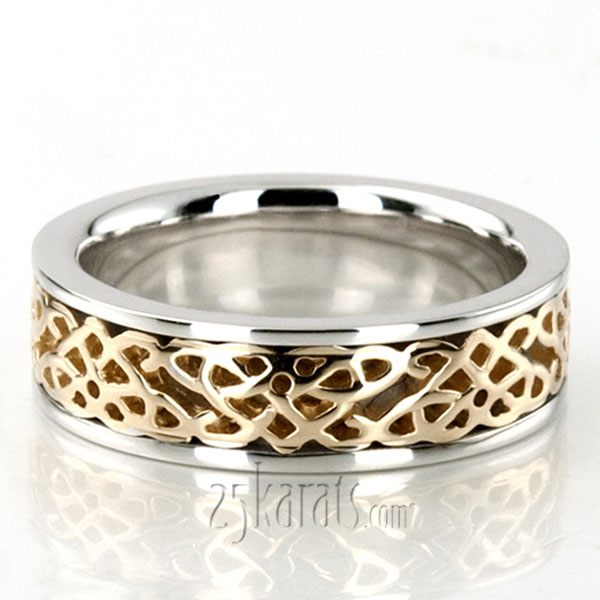 A gorgeous style, this Celtic wedding band has elaborate Celtic hearts all around. It's complete with shiny edges. This wedding band is available in 6, 7, 8, 9, 10mm, and Two Color Gold. The band is high polished.