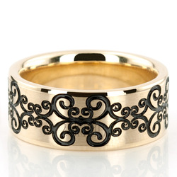 Attractive and contemporary! This 8mm wide Fancy Designer wedding band has a symmetrical spiral pattern done with black nano plating process. The band is satin finished.